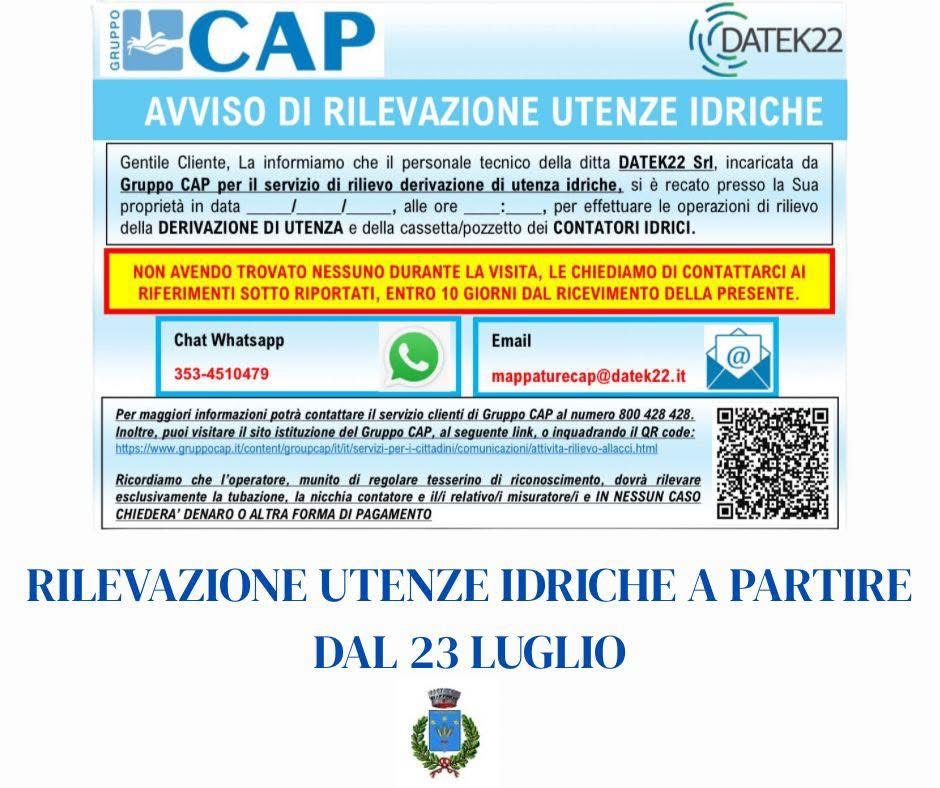 Si informa la cittadinanza che, a partire da MERCOLEDÌ 23 luglio, la società DATEK22 S.R.L., incaricata dal Gruppo CAP, effettuerà una serie di rilevazioni sul territorio comunale con l’obiettivo di aggiornare i dati della rete acquedottistica, individuando la posizione del tratto di allacciamento alla rete e del punto di fornitura (contatore).