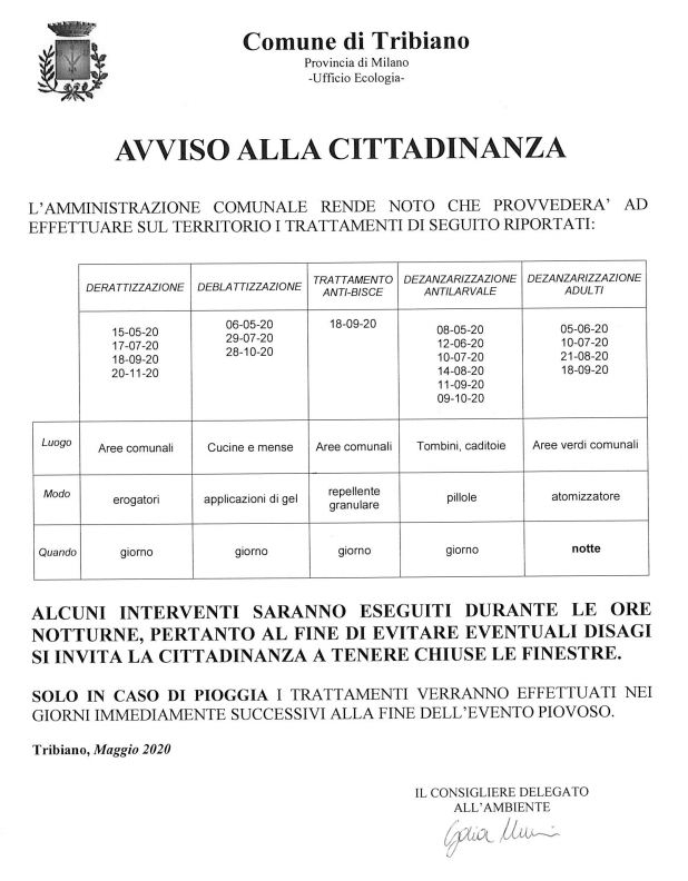 Si informa la cittadinanza che sono state calendarizzate le date per i trattamenti di disinfestazione e derattizzazione che verranno effettuati sul territorio comunale.