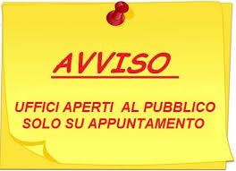 L'ACCESSO AGLI UFFICI COMUNALI E' CONSENTITO ESCLUSIVAMENTE SU APPUNTAMENTO DA RICHIEDERE CON UNA DELLE SEGUENTI MODALITA':