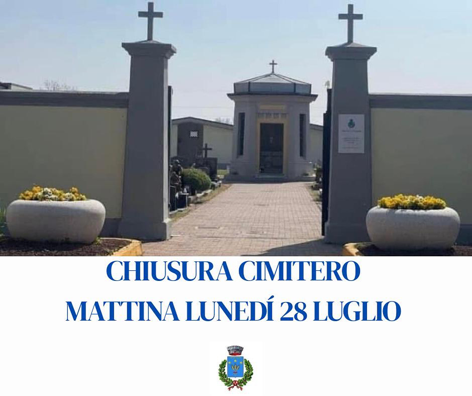 Si informa la cittadinanza che, al fine di consentire l’effettuazione di lavori di manutenzione, il cimitero sarà chiuso nella mattinata di lunedì 28 luglio.
